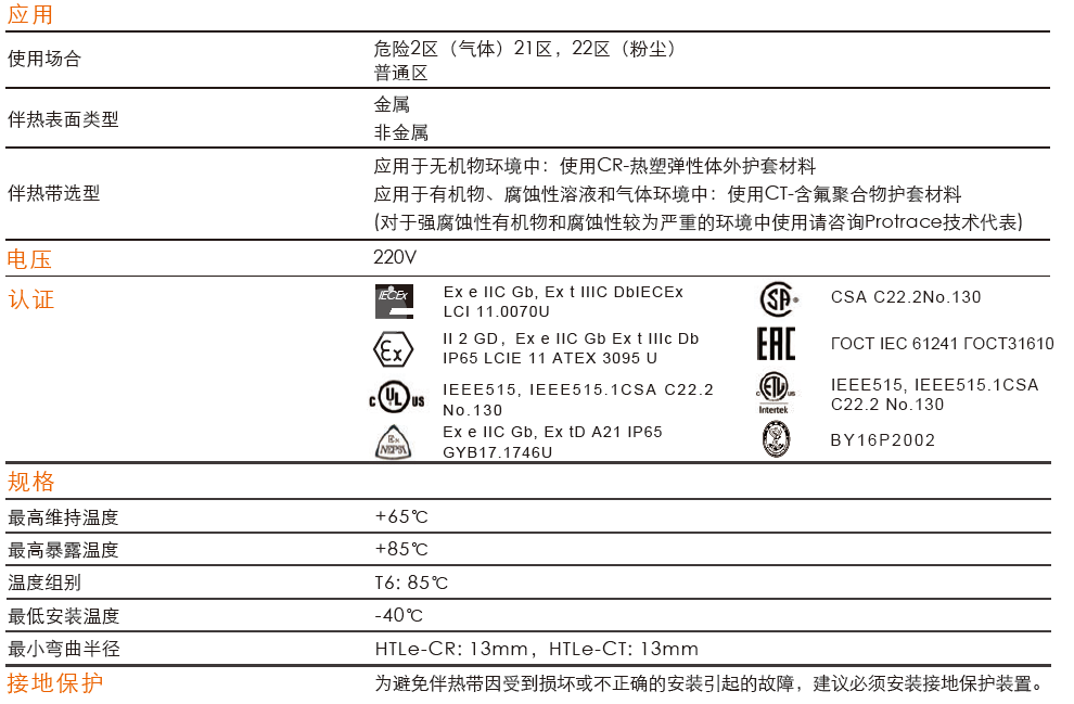 ●普瑞热斯 pro traceHTLe型自限温伴热带可在防爆环境中使用,工艺维持温度最高达+65℃。
